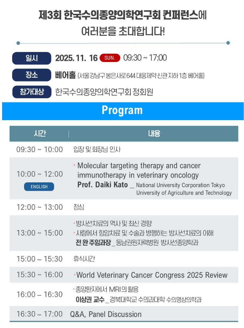 [한국수의종양의학연구회 컨퍼런스, 11월16일 개최...10월말까지 등록]